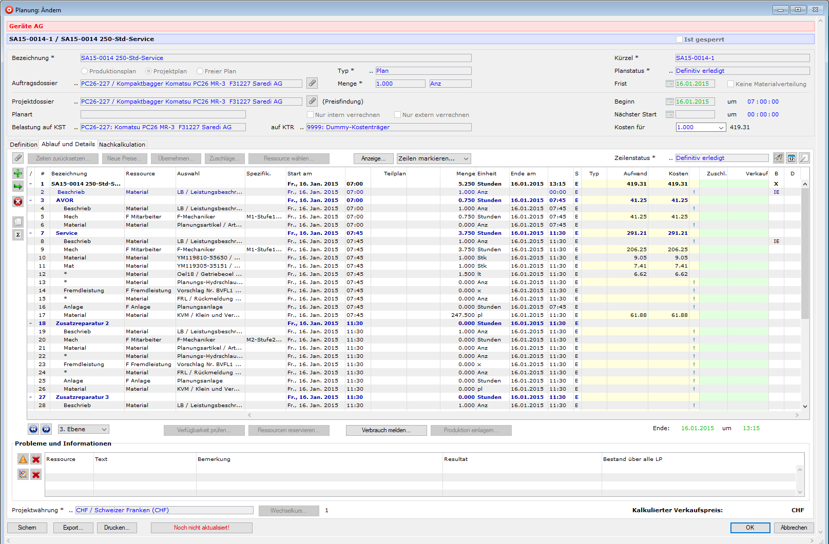 Die eigentliche Planbearbeitung geschieht hier im Projektplan. Hier werden die bekannten Ressourcen und Mengen eingetragen. Noch Unbekanntes bleibt offen. Es wird auf die Planzeilen zurückgemeldet, auch auf Planzeilen mit freien Planartikeln, Plananlagen, F-Mitarbeiter.