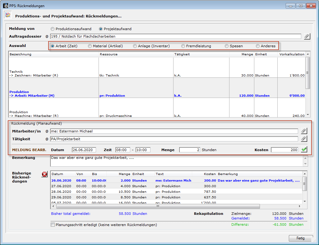 Im Projektplan kann der Menüpunkt Optionen - Rückmeldung Projektaufwand... (CTRL - Shift - R) gewählt werden, um Änderungen an bereits gemachten Rückmeldungen vorzunehmen.