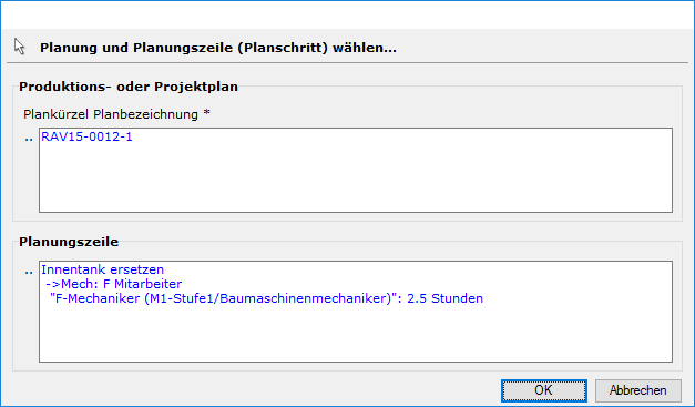 - Mit den ..-Zeichen kann der Plan und die Planzeile gesucht werden. Sofern das Plankürzel bekannt ist, kann es ins erste Feld eingetragen werden.