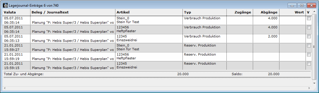 Verknüpfungen Lagerjournal Produktions- und Projektpläne können im Output oder im Input mit ihren Lagerjournal-Einträgen verknüpft werden (siehe entsprechenden Menüpunkt). Mit CTRL+B können die Zeiten, Mengen und Beträge totalisiert werden.