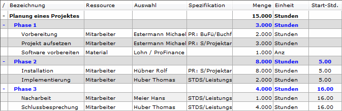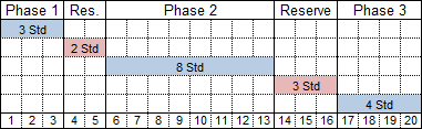 Wenn die Start-Stunden nicht verändert, sondern so übernommen werden, wie es BossERP vorschlägt, dann sind keine Reserven vorgesehen. Die mindestens benötigten Stunden stimmen mit den geplanten Stunden überein. Durch Setzen von andern Start-Stunden, also Stunden, die grösser sein müssen als die vorangegangene(n) Phase(n) mindestens benötigt haben, gibt es sog. Reservestunden. Beispiel: