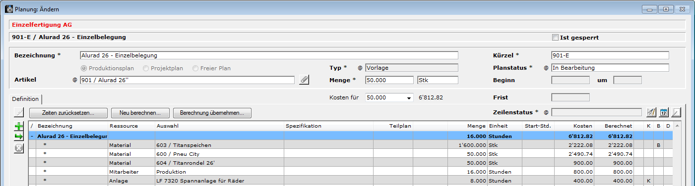 Beispiel 1: Produktion von 50 Rädern (Einzelbelegung)