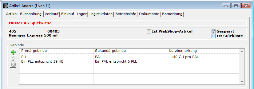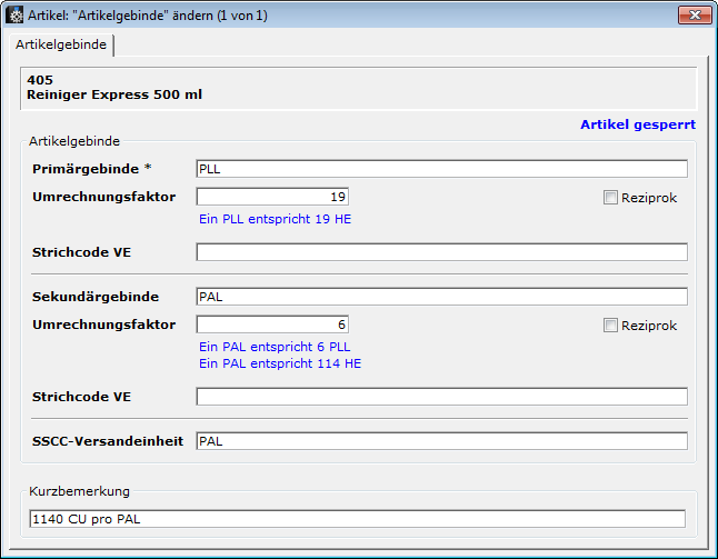 | Umrechnungsfaktor | Als Umrechnungsfaktor gilt die logische richtige Stückzahl, die zum Primärgebinde gehört. Als Sekundärgebinde ist im obigen Beispiel das Normalformat gewählt worden. |