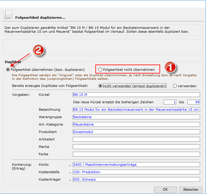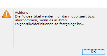 - Stellt man den Radiobutton "Folgeartikel übernehmen bzw. duplizieren", erscheint