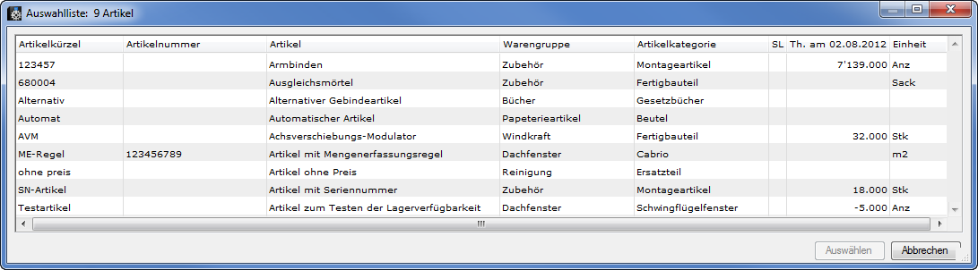 Bei der Auswahl von Artikeln (z.B. bei Belegen bzw. Bestellbelegen) wird folgende Auswahlliste gezeigt (Beispiel: Alle Artikel, die mit "A" in der Bezeichnung beginnen):