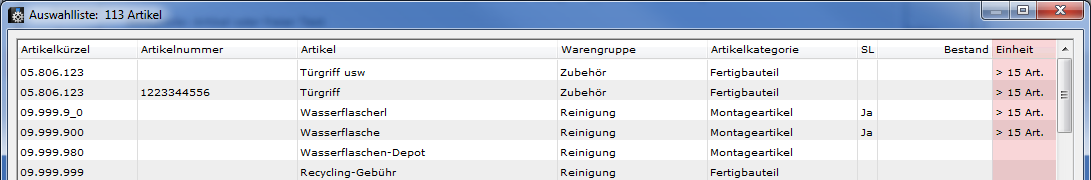 Die Bestände werden - aus Performance-Gründen - nur angezeigt, wenn nicht mehr als 15 Artikel in der Auswahlliste stehen. Andernfalls wird folgendes angezeigt (hier mit 17 Artikeln in der Auswahlliste):