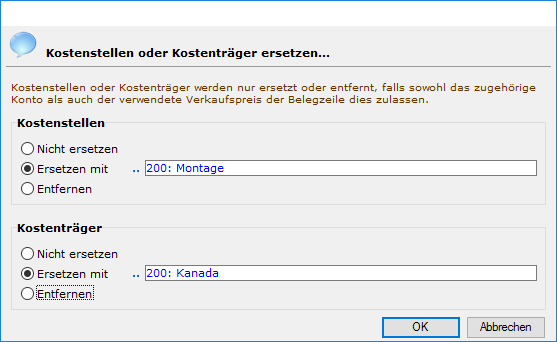 Es erscheint ein Verarbeitungsprotokoll, welches jede vorgesehene, zu ändernde Belegzeile auflistet und Hinweise gibt, ob KST/KTR geändert/entfernt wurde oder warum nicht. So dürfen beispielsweise KST/KTR nicht entfernt werden, wenn die Vorgabe des Ertragskontos dies nicht zulässt oder die Vorgabe im Verkaufspreis die Änderung nicht zulässt.
