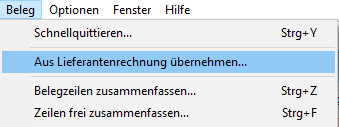 Im Register Belegzeilen wird der Menüpunkt Aus Lieferantenrechnung übernehmen gewählt: