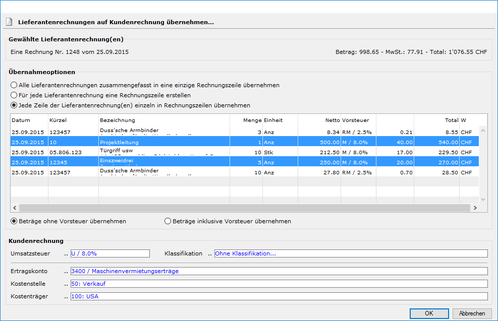 - Sollen Lieferantenrechnungszeilen in der Kundenrechnung verschiedene Umsatzsteuer-Codes erhalten oder auf verschiedene Ertragskonten gebucht werden, müssen sie einerseits zeilenweise und andererseits in mehreren Durchläufen übernommen werden.