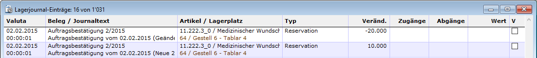 Die positive Menge 10 wird im Lagerjournal mit Menge -20 korrigiert: