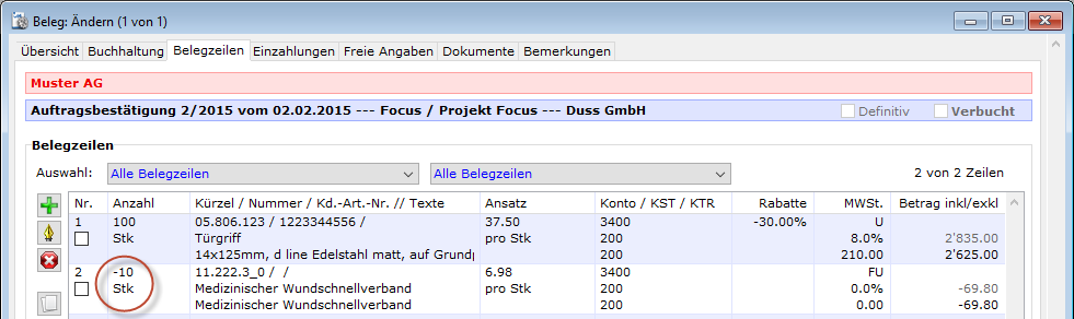 Falls die Zeilenmengen nicht umgekehrt werden können, weil die Lagerbestände bereits aktualisiert worden sind, dann soll die Belegzeile, sofern der Beleg nicht bereits als Folgebeleg verarbeitet worden ist, manuell abgeändert werden, was folgendes bewirkt (Beispiel: Menge 10 wird in einer Belegzeile einer Auftragsbestätigung auf Menge -10 abgeändert):