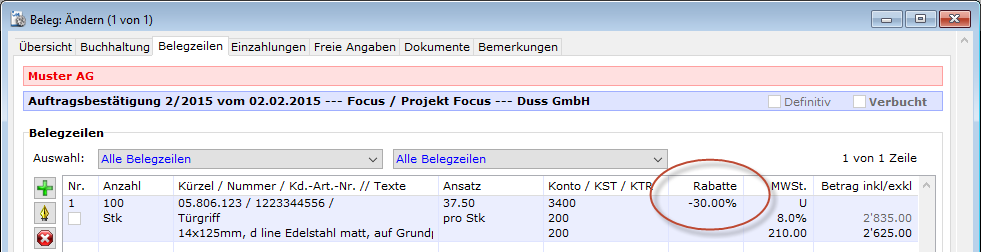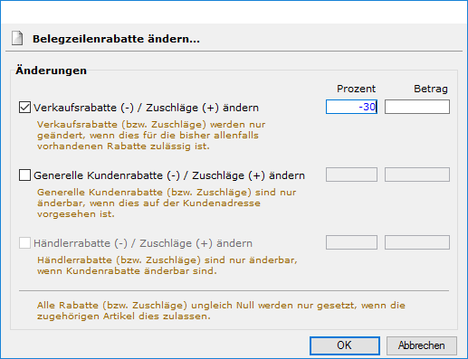 Zeilenrabatte ändern Im Beleginput, Register Belegzeilen können in markierten Belegzeilen Zeilenrabatte geändert werden (mittels Menüpunkt Beleg - Zeilenrabatte ändern): Das bewirkt folgendes: