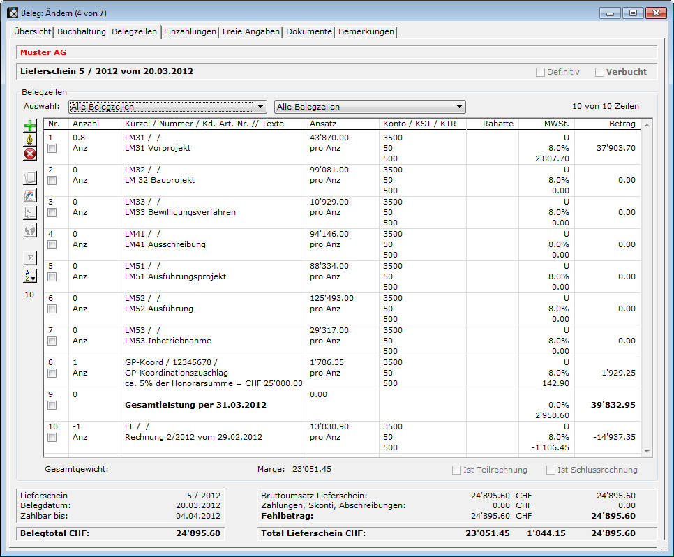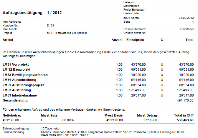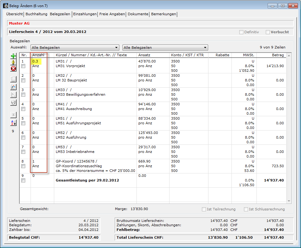 Aus der Auftragsbestätigung wird ein Duplikat in einen Lieferschein generiert. Im Lieferschein werden die Mengen mit 0.Zahl (null.Punkt Zahl) anstelle von Prozenten eingetragen. "Null.Punkt Zahl (z.B. 0.70) ist gleichbedeutend wie 70%). Im Bauwesen werden den Rechnungen zuerst die Gesamtleistungen des Gesamtauftrages dargestellt. Darunter werden die bereits erstellten Rechnungen in Abzug gebracht.