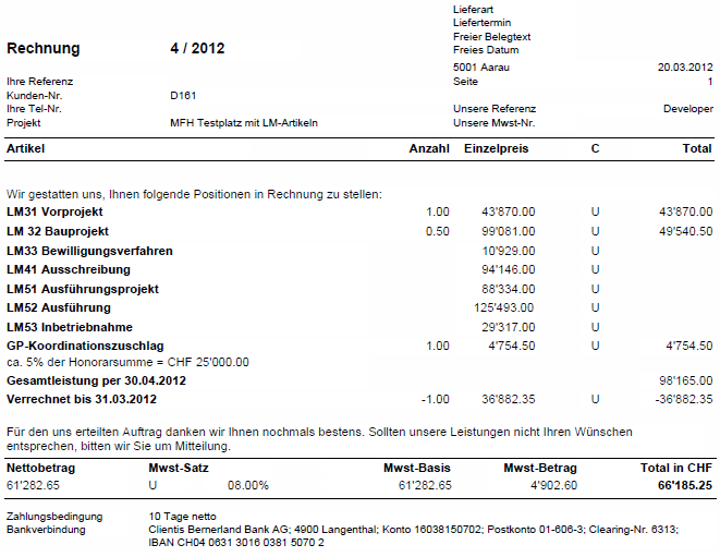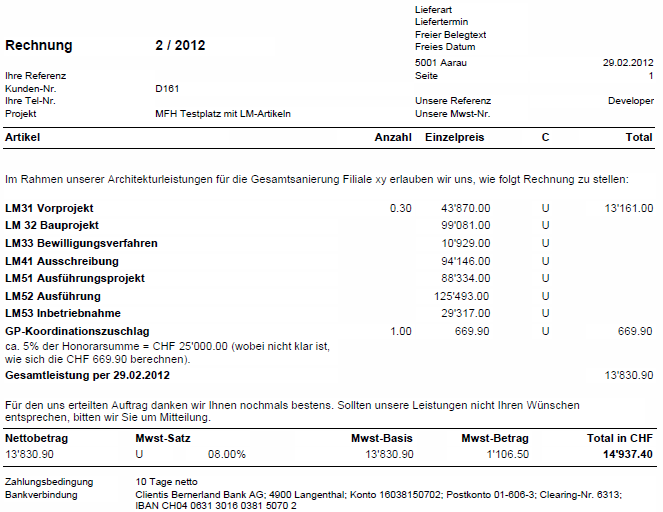 Als letzte Belegzeile totalisiert man mittels eines Zwischentotals zur Gesamtleistung per .... Die Koordinationszuschläge in % der Honorarsumme wird manuell gerechnet.
