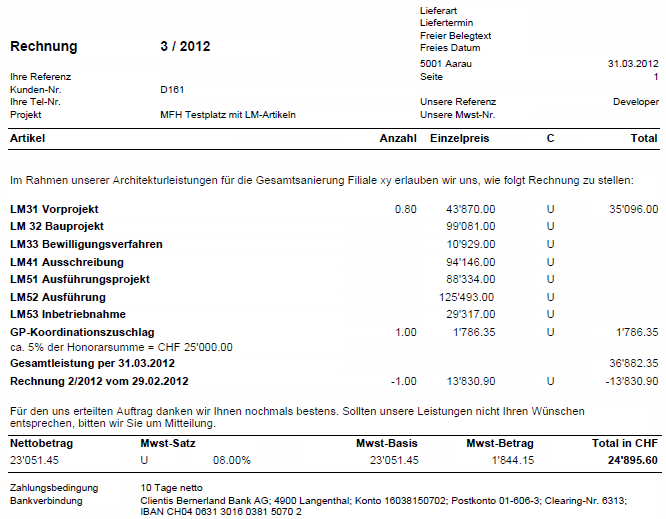 Am Schluss wird wiederum ein Zwischentotal für die Gesamtleistung per ... eingebaut. Danach zieht man (manuell) entweder die bisher erfolgten Rechnungen einzeln oder alle bisherigen Rechnungen in einem Gesamttotal ab. AchtenSie auf die richtigen Netto- bzw. Bruttobeträge dieser bisherigen Rechnungen und damit auf die Mwst.