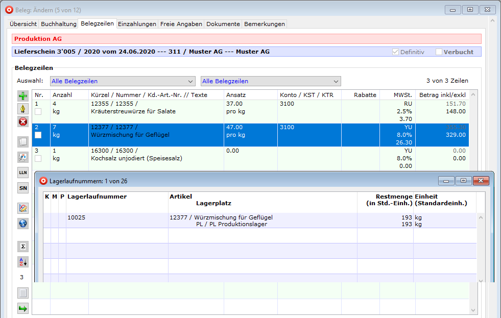 Mit Menüpunkt Beleg - Lagerlauf- bzw. Chargennummern werden die der Belegzeile verwendeten LLN/CHN aufgelistet.