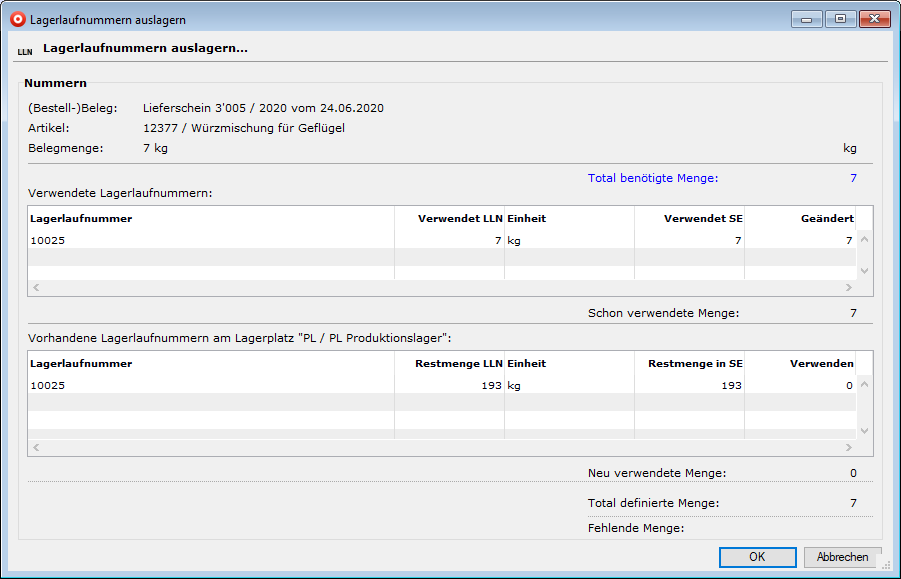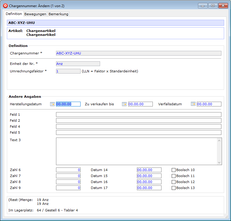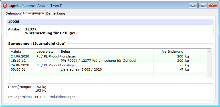 Es wird die noch vorhandene Restmenge angezeigt. Mit Doppelklick auf die LLN/CHN können im entsprechenden Register entweder die bisherigen Bewegungen oder die Definitionen oder die Bemerkungen gezeigt werden: