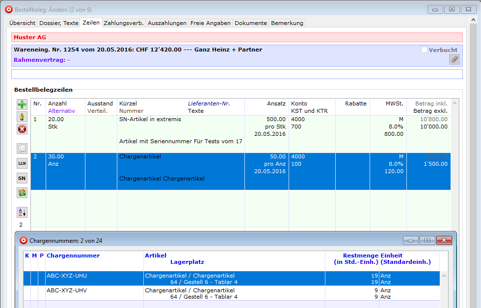 Mit Menüpunkt Bestellbeleg - Lagerlauf- bzw. Chargennummern werden die der Bestellbelegzeile verwendeten LLN/CHN aufgelistet.