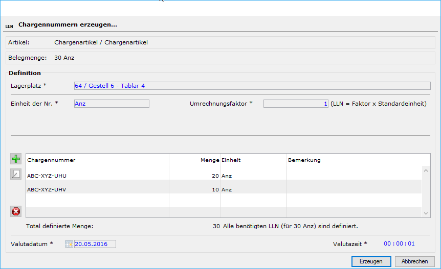 Es wird die noch vorhandene Restmenge angezeigt. Mit Doppelklick auf die LLN/CHN können im entsprechenden Register entweder die Definitionen zur LLN/CHN, die bisherigen Bewegungen oder Bemerkungen gezeigt werden: