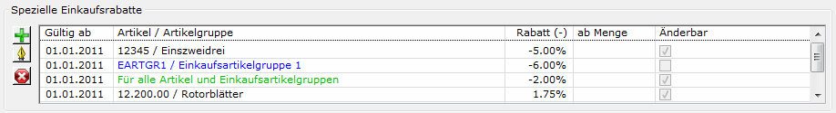 | Grüne Einträge | Einkaufsrabatte oder Zuschläge, die für alle übrigen Artikel und Einkaufsartikelgruppen gelten |