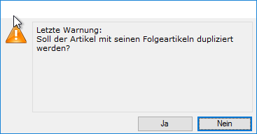 - Der Radiobutton steht zu Beginn auf "Folgeartikel nicht übernehmen". Damit würde der markierte Artikel normal dupliziert, obwohl er Folgeartikel hat.