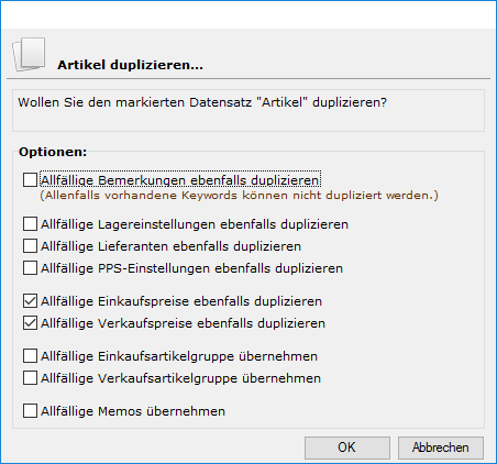 Zuerst erscheint der normale Duplizier-Dialog für Artikel, in welchem eingestellt werden kann, was dupliziert werden soll: