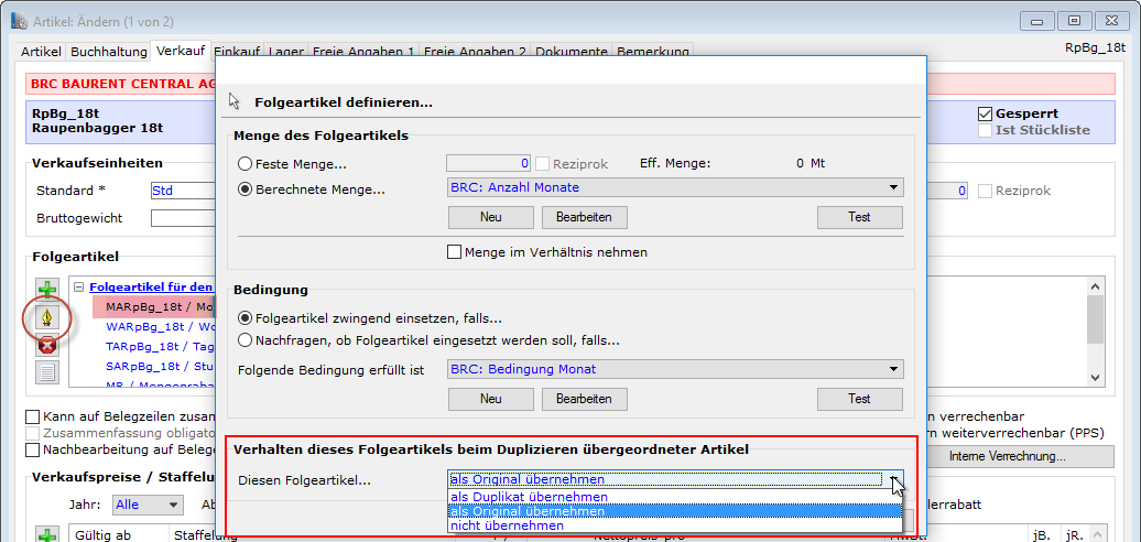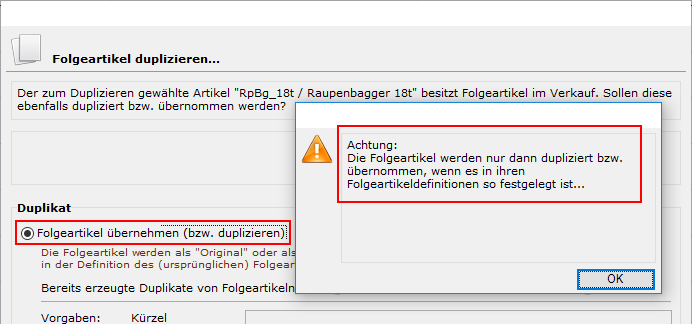 "Als Duplikat übernehmen" bedeutet, dass der Folgeartikel erneut angelegt wird.