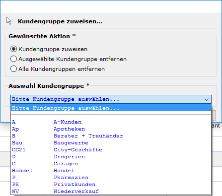- Alternativ können Sie die Kundengruppe unter Menüpunkt *Adressen - Kundengruppe zuweisen...*bzw. entfernen.