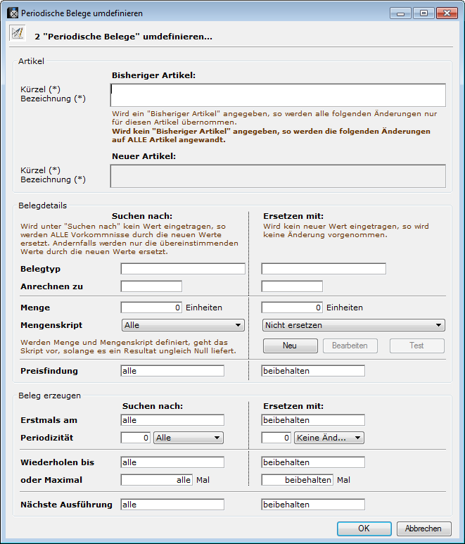 - bzw. das nächste Ausführungsdatum. Bevor Periodische Belege mit "Preisfindungsdatum gültig ab" umdefiniert werden, sollten die neuen Preise bereits angelegt sein. Dies ist zwar nicht zwingend, aber vom Ablauf her eher logisch. Werden unter der Spalte „Suchen nach“ keine Werte eingetragen, werden alle Vorkommnisse durch die neuen Werte ersetzt. Andernfalls werden nur die übereinstimmenden Werte durch die neuen Werte ersetzt. Wird kein neuer Wert eingetragen, so wird keine Änderung vorgenommen. Werden gleichzeitig Mengen und Mengenskripts definiert, hat das Script Vorrang vor der Menge, solange das Resultat nicht Null ist. Bleibt im Preisfindungsdatum in der Spalte "Suchen nach“ der Eintrag "alle" stehen, dann werden alle Artikel genommen, unabhängig eines Eintrages im Preisfindungsfeld. Bleibt im Preisfindungsdatum defaultmässig "alle" stehen, erfolgt keine Änderung. Andernfalls wird auf ein neues Datum (z.B. 01.01.2011) geändert. Das Gleiche gilt für die Einträge in den Feldern „Wiederholfen bis“ und „Maximal“, sofern dort "alle“ steht. Auch die "Nächste Ausführung", die beim erst- bzw. letztmaligen Anlegen festgelegt wird, kann neu gesetzt werden.