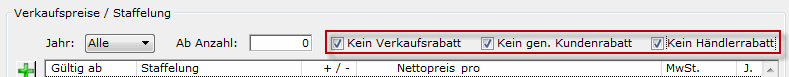In allen Arten der Verkaufspreise kann die Checkbox "Verkaufpreis nicht weiter rabattierbar" gesetzt werden. Die Mutation erfolgt in den adäquaten Preisen (nicht in den Rabatten) in folgenden Tabellen: