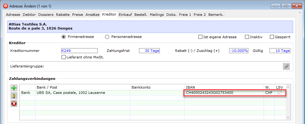 - Im entsprechenden Register „Kreditor“ im Adressinput kann man das Flag „LSV“ sehen:
