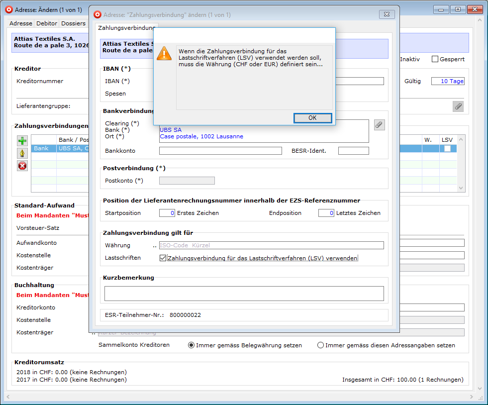 - Ist es gesetzt, muss zwingend die Währung angegeben werden. Nur CHF und EUR sind zulässig, weil LSV nur mit diesen Währungen funktioniert.