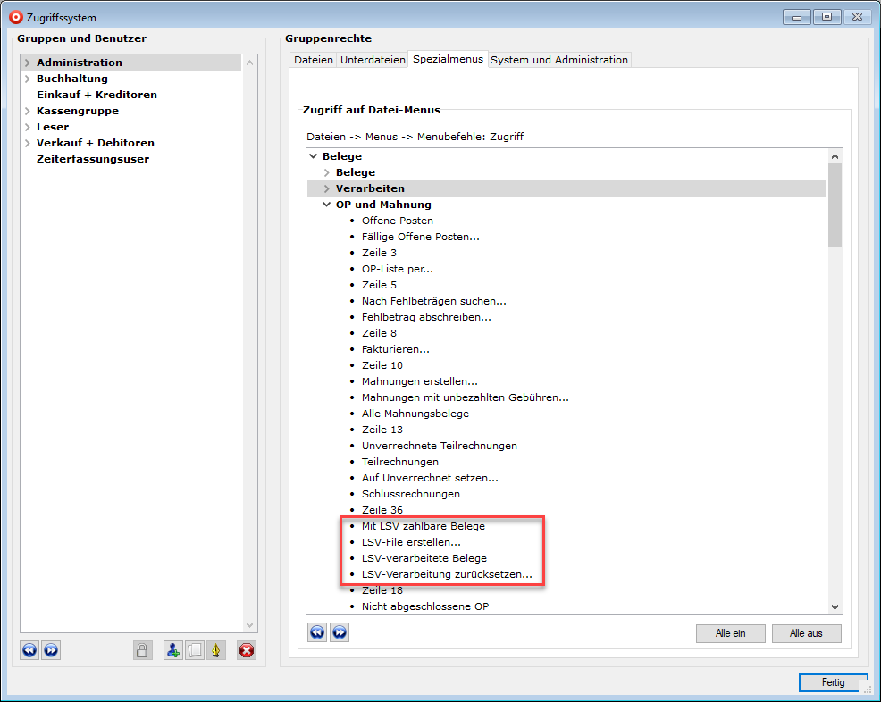 Zugriffssystem via "Spezialmenüs" steuerbar