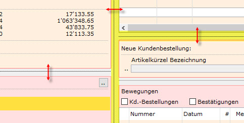 Es gibt in der Telemarketing-Maske 3 Splitter, um die Inhalte sauber anzupassen: 2 horizontale (in der Höhe) und 1 vertikaler (in der Breite) . Die Einstellung bleibt erhalten: