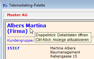 Wenn Sie mit dem Cursor z.B. über den Titel der Adresse fahren, erscheint der Tool-Tipp dazu (gelbes Kästchen mit entsprechenden nützlichen Informationen für die Handhabung von Tastenkombinationen):