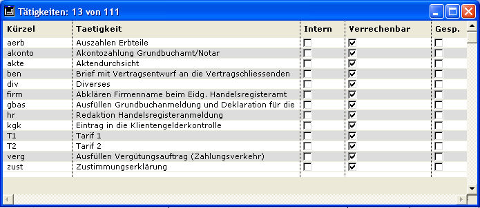 Tätigkeiten sind Leistungsarten, die mit der notariellen Arbeit in direktem Zusammenhang stehen und normalerweise weiterverrechenbar sind und dem Ertrag gutgeschrieben werden. Beispiele: