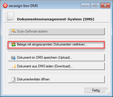 - oder über die zentrale Funktion mit Menüpunkt Datei (Mac: Ablage) - Dokumentenmanagementsystem via "Belege mit eingescannten Dokumenten verlinken" durchgeführt werden: