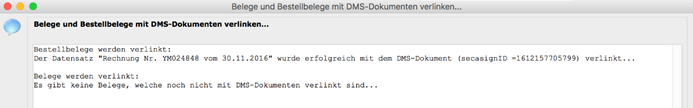- Nach der Ausführung wird ein Protokoll angezeigt und auf dem Beleg mit dem Barcode ist der Hinweis angebracht, dass die Verknüpfung mit dem DMS erfolgreich war.