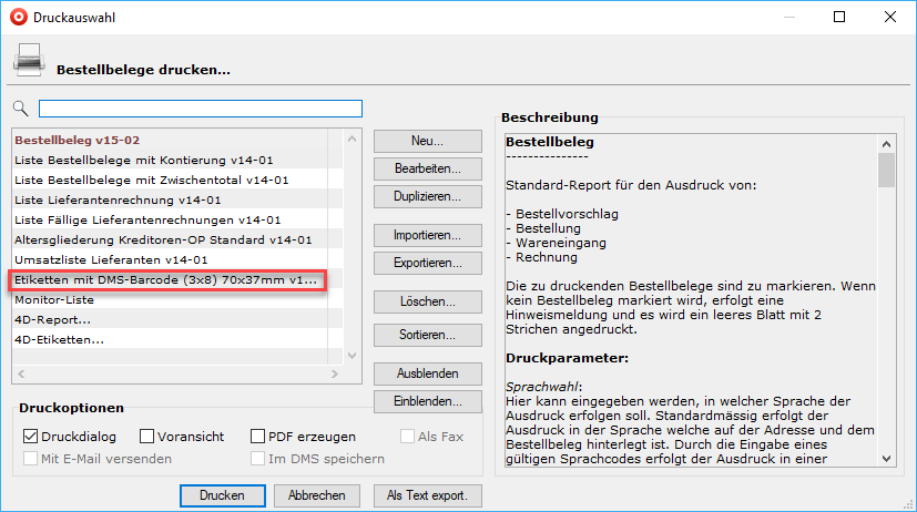Für den Druck von Barcode-Etiketten steht in bossERP bei den Bestellbelegen ein Druckreport "Etiketten mit DMS-Barcode (3x8) 70x37mm" zur Verfügung, welcher solche Barcodes erzeugt. Bitte beachten Sie die Informationen auf dem Druckreport.
