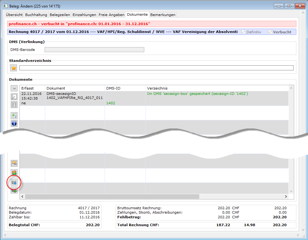 Beim automatischen Upload wird das Dokument im DMS als PDF abgelegt und die DMS-ID im Register Dokumente angezeigt.