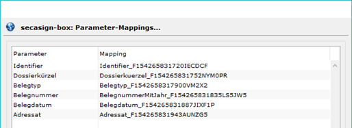 - Zu den einzelnen Prozessen müssen Parameter für die Dokumentenbezeichnung erfasst werden. Hierzu müssen die zuvor abgespeicherten XML zur Hand genommen werden. Beispiel Belege:Die sechs einzelnen Parameter müssen nun im XML gesucht und das entsprechende Mapping in bossERP hinterlegt werden. Als Beispiel Identifier: