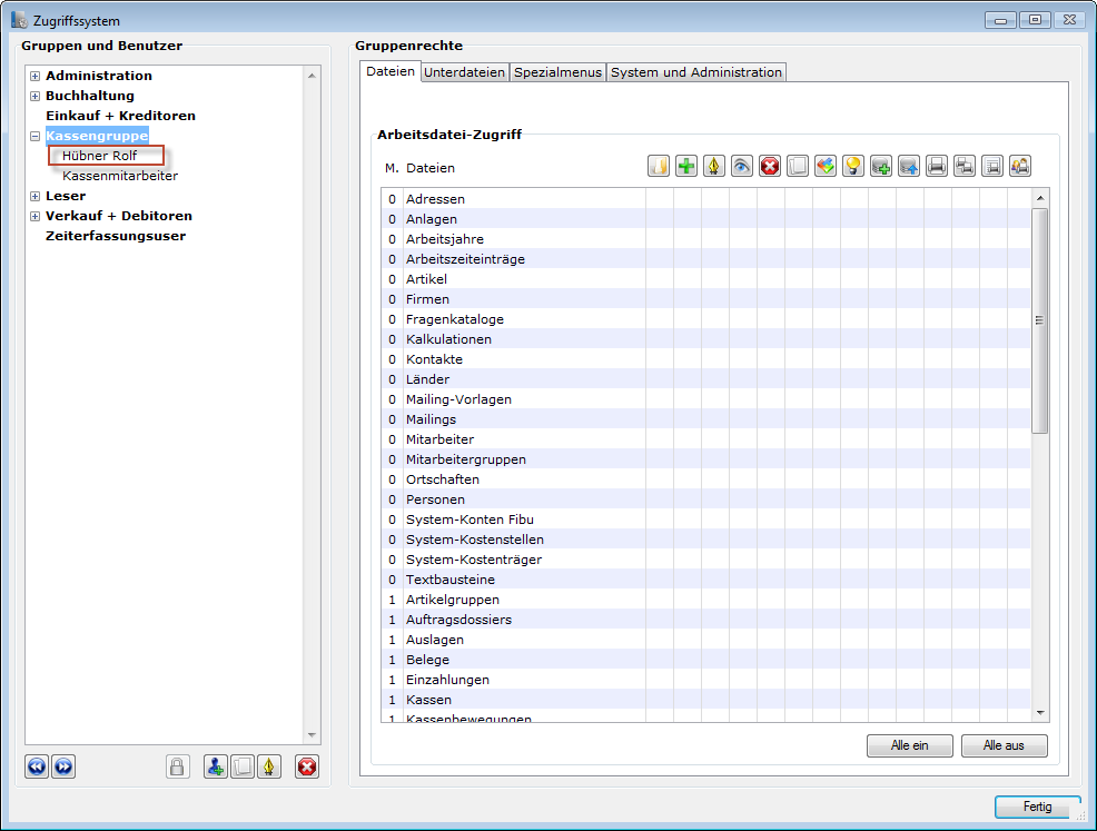 Dateien - Mitarbeitende - Mitarbeitergruppen Kassen-Mitarbeiterinnen und -mitarbeiter können in Mitarbeitergruppen gegliedert werden. Existiert in Zentrale "Benutzer(innen) und Passworte) der Benutzer "Kassenmitarbeiter", können Kassen-Workstations ohne User-Anmeldung direkt zur Mitarbeiter-Anmeldung gehen und die Kasse sofort starten. Mit der Bezeichnung "Kassenmitarbeiter" ist gemäss Zugriffssystem der User gemeint und nicht der sich an der Kasse konkret angemeldete Mitarbeiter.