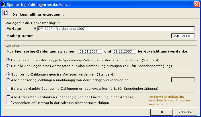 Wenn man die Einstellungen im Dialog "Dankesmailings erzeugen…" also unverändert lässt, werden die Angaben in der Sponsoring-Vorlage und in den Adressen korrekt berücksichtigt.