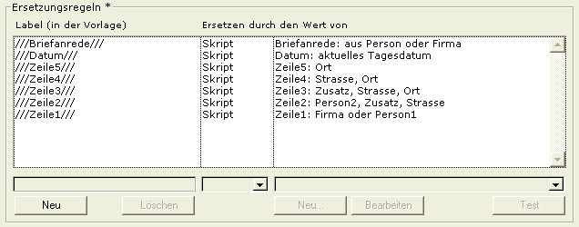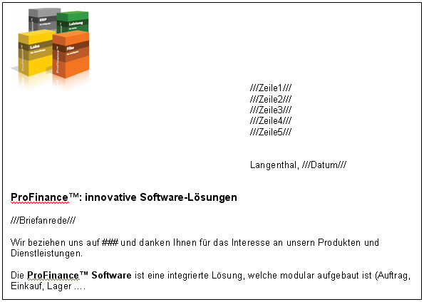 Anstelle von exakten Titeln wie Firma, Person oder Strasse sind die Bezeichnungen der Platzhalter im Word-Dokument als ///Zeile/// anzugeben. Hinweis: Wir empfehlen aufgrund von gemachten Erfahrungen, dass die Zeichenfolge /// - zwar selten - zu Problemen führen kann. Verwenden Sie an deren Stelle z.B * oder ***.