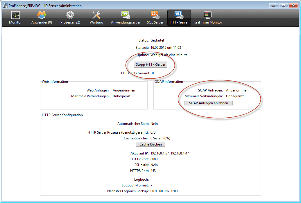 Sofern der HTTP-Server und die SOAP-Anfragen in Betrieb stehen, sehen die Einstellungen wie folgt aus.