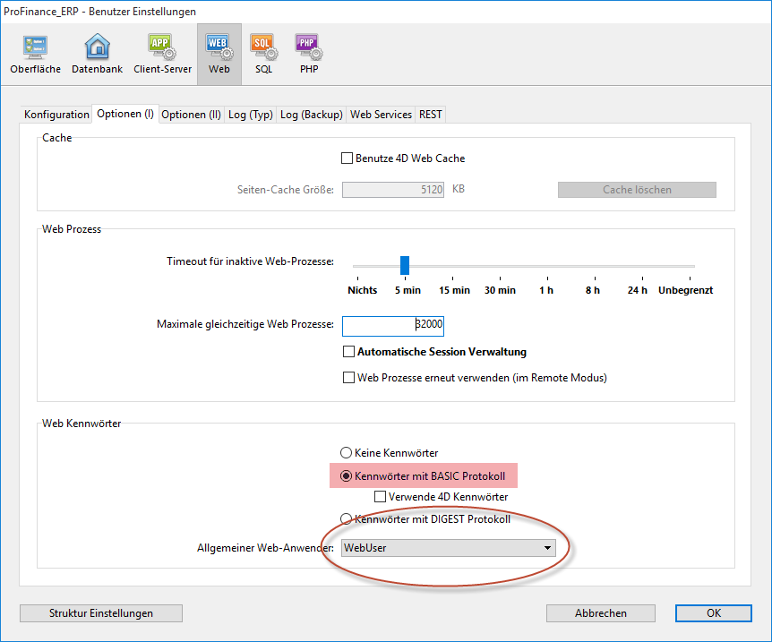 - der Allgemeine Web-Anwender muss "WebUser" sein.