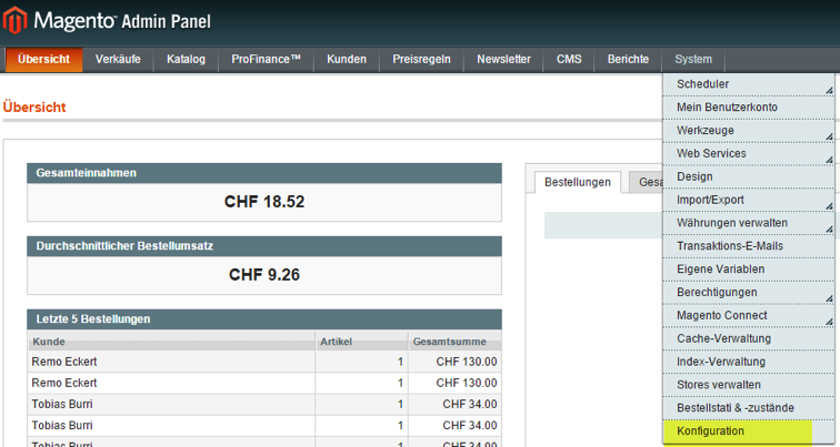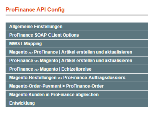 Grundkonfiguration WebShop Mit Klick auf „System - Konfiguration“ gelangt man in die Magento-Konfiguration: In der linken Spalte am Ende der Seite auf „BossAPI Config“ klicken: Die nachfolgenden Einstellungsmöglichkeiten erscheinen: