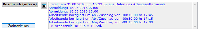 Einerseits werden hier die automatischen Einträge und die automatischen Korrekturen protokolliert. Andererseits stehen hinter dem Button "Zeitkorrekturen" weitere automatisch generierte Korrekturen, die dann entstehen, wenn nach der Verarbeitung von AZ-Terminaleingaben weitere Zeiten z.B. im Persönlichen Zeiterfassungsblatt eingegeben worden sind.