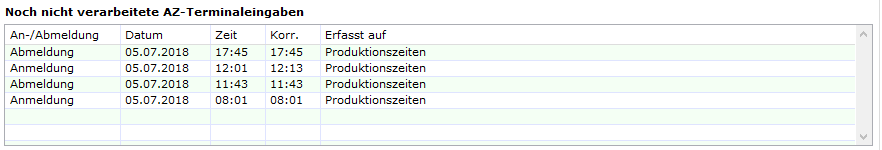 Im Mitarbeiter-Register - Arbeitszeiten werden Sie im Bereich "Noch nicht verarbeitete AZ-Terminaleingaben" angezeigt