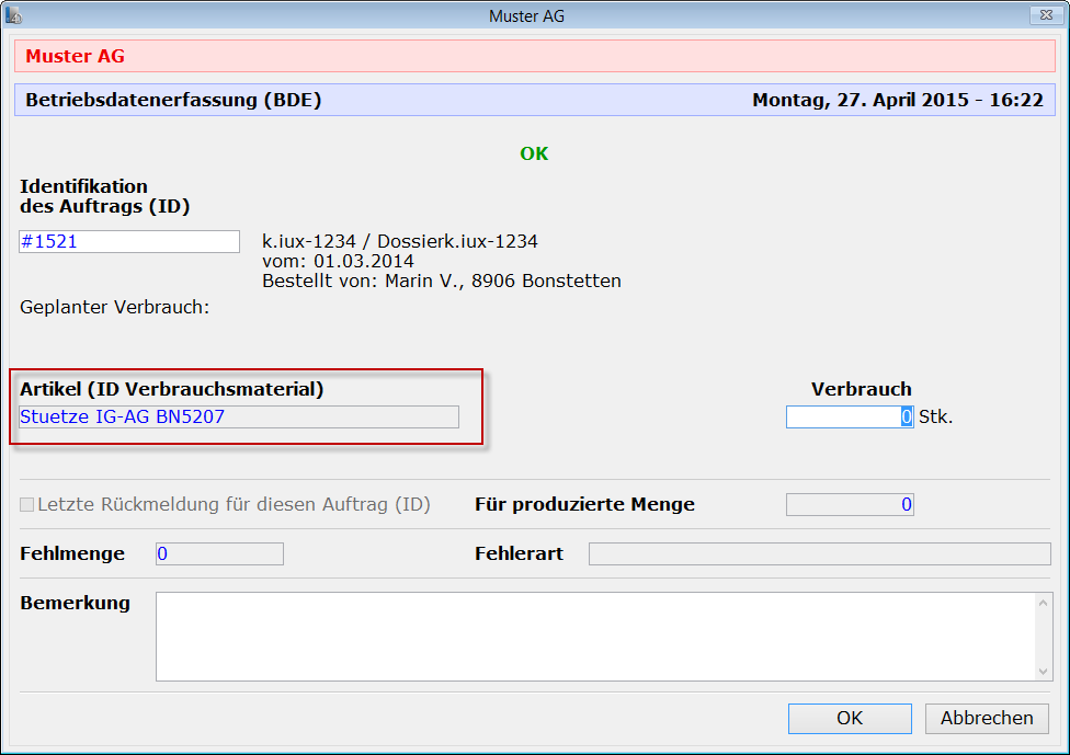 Siehe die gelbe Markierung. Findet die BDE ein Dossier mit der eingetragenen ID, verzweigt die BDE in das folgende neue Dialogfenster: